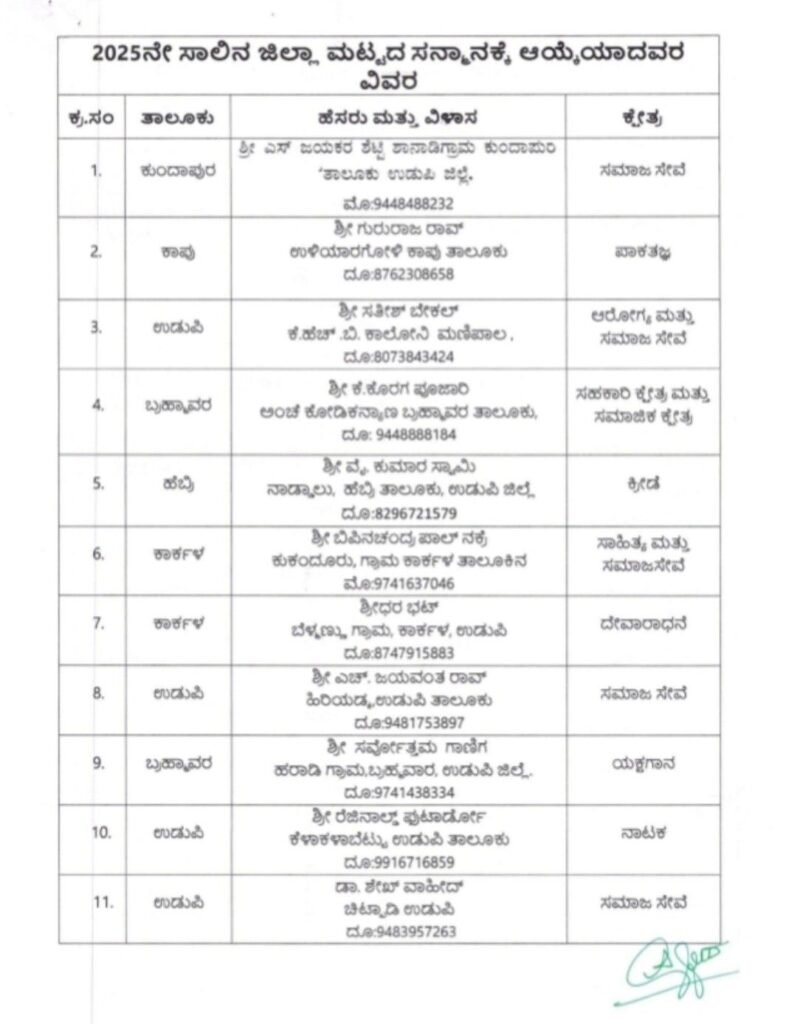 Home Latest ಉಡುಪಿ : 2025 ನೇ ಸಾಲಿನ ಜಿಲ್ಲಾ ರಾಜ್ಯೋತ್ಸವ ಪ್ರಶಸ್ತಿ ಪುರಸ್ಕೃತರ ವಿವರ ಪ್ರಕಟ….!!Latestಉಡುಪಿ : 2025 ನೇ ಸಾಲಿನ ಜಿಲ್ಲಾ ರಾಜ್ಯೋತ್ಸವ ಪ್ರಶಸ್ತಿ ಪುರಸ್ಕೃತರ ವಿವರ ಪ್ರಕಟ….!!By Prime Tv News Desk - October 31, 2025FacebookTwitterPinterestWhatsApp ಉಡುಪಿ: 2025 ನೇ ಸಾಲಿನ ಜಿಲ್ಲಾ ರಾಜ್ಯೋತ್ಸವ ಪ್ರಶಸ್ತಿ ಪುರಸ್ಕೃತರ ವಿವರ ಪ್ರಕಟಗೊಂಡಿದ್ದು, ಜಿಲ್ಲೆಯ 77 ಮಂದಿಯ ಹೆಸರು ಪ್ರಶಸ್ತಿಗೆ ಆಯ್ಕೆಗೊಂಡಿದೆ. ಪ್ರಶಸ್ತಿ ಪುರಸ್ಕೃತರ ವಿವರ ಈ ಕೆಳಕಂಡಂತಿದೆ.