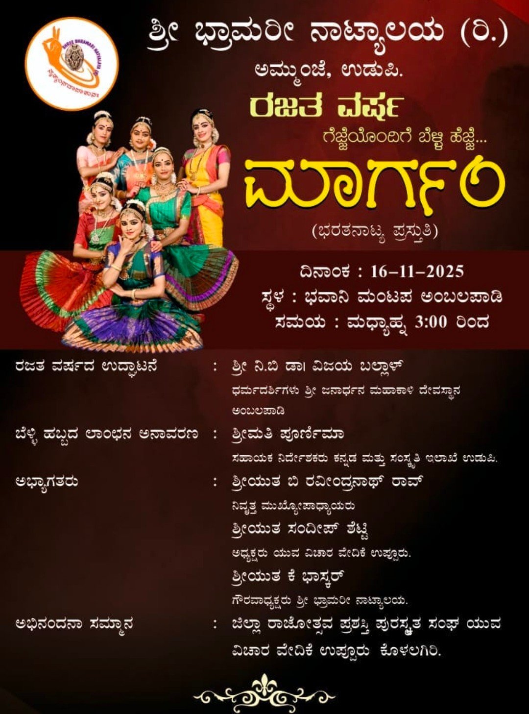 ಉಡುಪಿ : ಶ್ರೀ ಭ್ರಾಮರಿ ನಾಟ್ಯಾಲಯ ಅಮ್ಮುಂಜೆ ಈ ವರ್ಷ ರಜತ ಸಂಭ್ರಮ ದಲ್ಲಿದ್ದು “ರಜತ ವರ್ಷ: ಗೆಜ್ಜೆಯೊಂದಿಗೆ ಬೆಳ್ಳಿ ಹೆಜ್ಜೆ” ಧ್ಯೇಯ ದೊಂದಿಗೆ ಯೋಜನೆ ರೂಪಿಸಿಕೊಂಡು ದಿನಾಂಕ: 16/11/2025 ಭಾನುವಾರ ಭವಾನಿ ಮಂಟಪ ಅಂಬಲಪಾಡಿ ಯಲ್ಲಿ ಸಮಯ ಸಂಜೆ 3.00 ಗಂಟೆಗೆ “ಮಾರ್ಗಂ – ಭರತ ನಾಟ್ಯ ಪ್ರಸ್ತುತಿ” ಯೊಂದಿಗೆ ರಜತ ವರ್ಷದ ಉದ್ಘಾಟನಾ ಕಾರ್ಯಕ್ರಮ ಹಮ್ಮಿಕೊಂಡಿದ್ದಾರೆ.