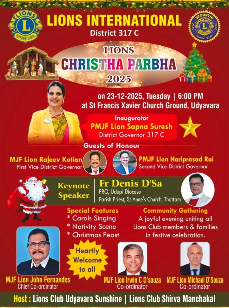 ಉದ್ಯಾವರದ ಸಂತ ಫ್ರಾನ್ಸಿಸ್ ಕ್ಸೇವಿಯರ್ ದೇವಾಲಯದ ಮೈದಾನದಲ್ಲಿ ಸಂಜೆ 6 ಗಂಟೆಗೆ ಜಿಲ್ಲಾ ಗವರ್ನರ್ ಲಯನ್ ಸಪ್ನಾ ಸುರೇಶ್ ಲಯನ್ಸ್ ಕ್ರಿಸ್ತ ಪರ್ಭ 2025 ಕಾರ್ಯಕ್ರಮವನ್ನು ಉದ್ಘಾಟನೆಗೊಳಿಸಲಿದ್ದು, ಪ್ರಥಮ ಉಪ ಗವರ್ನರ್ ಲಯನ್ ರಾಜೀವ್ ಕೋಟ್ಯಾನ್, ದ್ವಿತೀಯ ಉಪ ಗವರ್ನರ್ ಲಯನ್ ಹರಿಪ್ರಸಾದ್ ರೈ ಸಹಿತ ಹಲವು ಲಯನ್ಸ್ ನಾಯಕರುಗಳು ಮತ್ತು ಸಮಾಜದ ಗಣ್ಯ ಅತಿಥಿಗಳು ಮುಖ್ಯ ಅತಿಥಿಗಳಾಗಿ ಭಾಗವಹಿಸಲಿದ್ದಾರೆ. ಕಾರ್ಯಕ್ರಮದಲ್ಲಿ ಉಡುಪಿ ಧರ್ಮಪ್ರಾಂತ್ಯದ ಸಾರ್ವಜನಿಕ ಸಂಪರ್ಕ ಅಧಿಕಾರಿ, ತೊಟ್ಟo ಚರ್ಚಿನ ಪ್ರಧಾನ ಧರ್ಮಗುರುಗಳಾದ ವoದನೀಯ ಫಾ. ಡೆನ್ನಿಸ್ ಡೆಸಾ ಕ್ರಿಸ್ಮಸ್ ಸಂದೇಶ ನೀಡಲಿದ್ದಾರೆ.