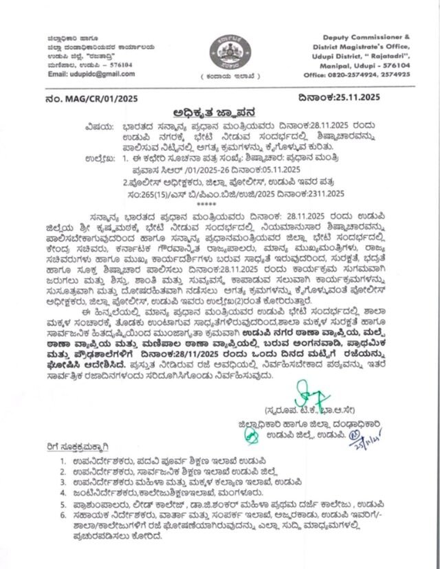 ಉಡುಪಿ : ಪ್ರಧಾನಿ ನರೇಂದ್ರ ಮೋದಿ ನವೆಂಬರ್ 28ರಂದು ಉಡುಪಿಗೆ ಭೇಟಿ ನೀಡಲಿರುವ ಹಿನ್ನೆಲೆ ಕಾನೂನು ಸುವ್ಯವಸ್ಧೆ ಕಾಪಾಡುವ ನಿಟ್ಟಿನಲ್ಲಿ ಪ್ರಾಥಮಿಕ ಹಾಗೂ ಪ್ರೌಢಶಾಲೆಗಳಿಗೆ ರಜೆ ಘೋಷಣೆ ಮಾಡಿ ಜಿಲ್ಲಾಧಿಕಾರಿ ಸ್ವರೂಪ ಟಿ. ಕೆ ಅವರು ಅದೇಶಿಸಿದ್ದಾರೆ.