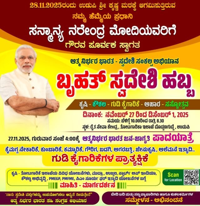 ಪ್ರಧಾನಿ ನರೇಂದ್ರ ಮೋದಿಯವರ ಉಡುಪಿ ಭೇಟಿ ಸಂಭ್ರಮಾಚರಣೆಗಾಗಿ ಹಮ್ಮಿಕೊಂಡಿರುವ ‘ಬೃಹತ್ ಸ್ವದೇಶಿ ಹಬ್ಬ’ ದ ಉದ್ಘಾಟನಾ ಸಮಾರಂಭದ ಪೂರ್ವಭಾವಿಯಾಗಿ ಆತ್ಮನಿರ್ಭರ ಭಾರತ ಜನ-ಜಾಗೃತಿ ಪಾದಯಾತ್ರೆಯು 27.11.2025, ಸಂಜೆ 4:00 ರಿಂದ ದೊಡ್ಡಣಗುಡ್ಡೆ ನೇಕಾರರ ಕಾಲೋನಿಯಿಂದ ರೈತ ಸೇವಾ ಕೇಂದ್ರದ ವರೆಗೆ ನಡೆಯಲಿದೆ.