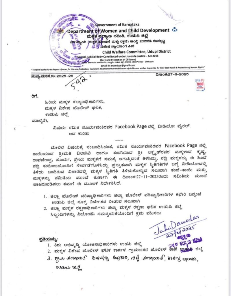 ಈ ಹಿಂದೆ ಲಕ್ಷ್ಮಣ್ ಅವರು ಮಕ್ಕಳಿಗೆ ಹೊಡೆದು ಕಿರುಕುಳ ನೀಡಿದ ಘಟನೆ ನಡೆದಿತ್ತು. ಬಳಿಕ ಮಕ್ಕಳನ್ನು ಮಕ್ಕಳ ವಿಶೇಷ ಕಲ್ಯಾಣ ಘಟಕದಲ್ಲಿ ಇಡಲಾಗಿತ್ತು. ಕೆಲ ಸಮಯಗಳ ಹಿಂದೆ ಮಕ್ಕಳು ಮರಳಿ ಮನೆ ಸೇರಿದ್ದರು. ಮಕ್ಕಳ ತಂದೆ ಲಕ್ಷಣ್ ಅವರು ಮತ್ತದೆ ವರ್ತನೆ ತೋರಿರುವುದು ರಮಿತಾ ಸೂರ್ಯವಂಶಿ ಅವರ ಗಮನಕ್ಕೆ ಬಂದಿತ್ತು.ಮನೆಯ ವಾಸ್ತವ ಸ್ಥಿತಿಯನ್ನು ಅವರು ಸಾಮಾಜಿಕ ಜಾಲತಾಣದಲ್ಲಿ ಹಂಚಿಕೊಂಡಿದ್ದರು. ಇದರಿಂದ ಎಚ್ಚೆತ್ತ ಮಕ್ಕಳ ಕಲ್ಯಾಣ ಸಮಿತಿಯು ಮಕ್ಕಳ ಪ್ರಸ್ತುತ ಸ್ಥಿತಿ–ಗತಿಗಳನ್ನು ಪರಿಶೀಲಿಸುವ ಅಗತ್ಯವನ್ನು ತುರ್ತು ಎಂದು ಪರಿಗಣಿಸಿದೆ.ಸಂಬಂಧಿತ ವಿಚಾರಣೆಗಾಗಿ ಮಕ್ಕಳ ಕಲ್ಯಾಣ ಸಮಿತಿಯ ಅಧ್ಯಕ್ಷೆ ಜೂಹಿ ದಾಮೋದರ್ ಅವರು, ಪೋಷಕರು ಹಾಗೂ ಮಕ್ಕಳು 27-11-2025ರಂದು ಸಮಿತಿಯ ಮುಂದೆ ಹಾಜರಾಗುವಂತೆ ನಿರ್ದೇಶನ ಹೊರಡಿಸಿದ್ದಾರೆ. ಜೊತೆಗೆ ಕೆಲ ಸೂಚನೆಗಳನ್ನು ನೀಡಿದ್ದಾರೆ.