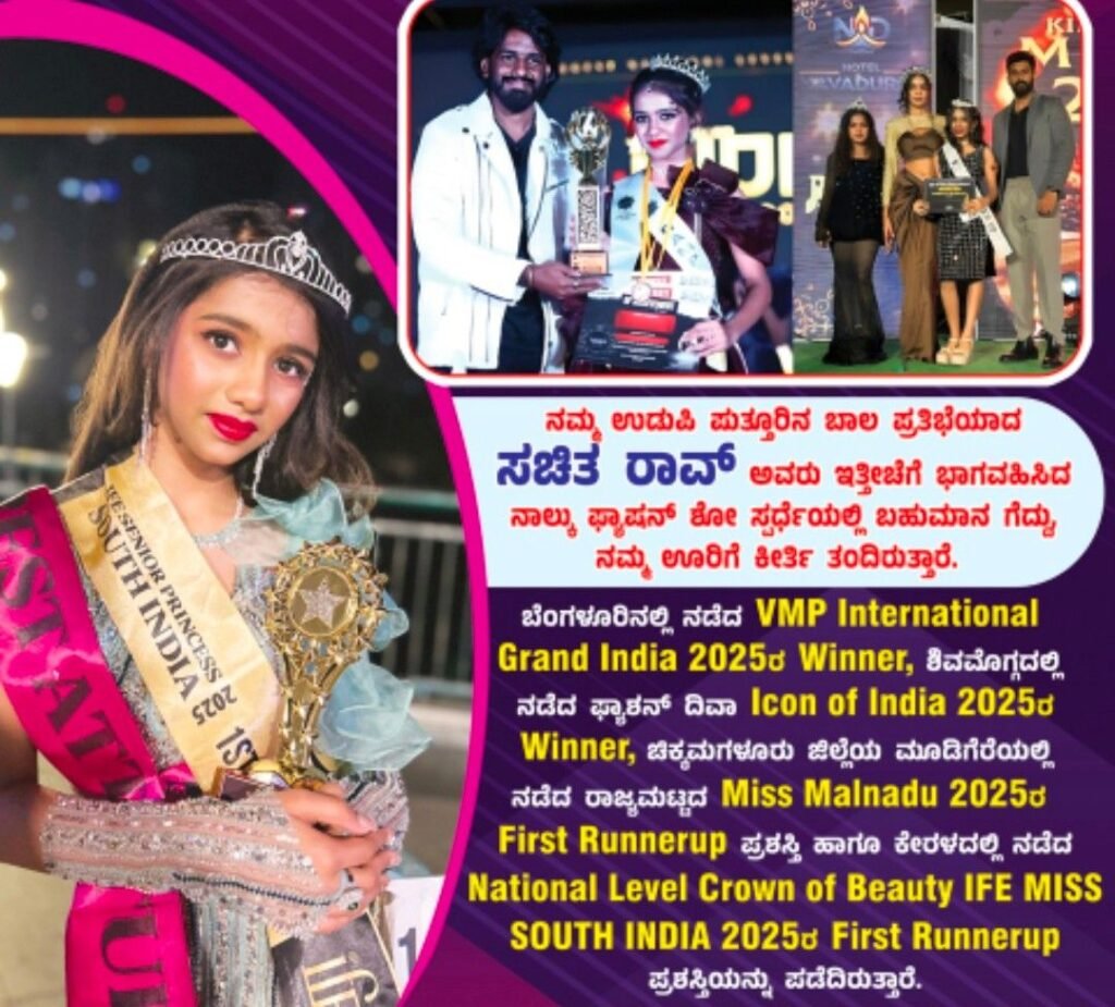 ಉಡುಪಿ : ನಗರಸ ಪುತ್ತೂರು ನಿವಾಸಿ ಸಚಿನ್ ರಾವ್ ಹಾಗೂ ಅಶ್ವಿನಿ ರಾವ್ ಯವರ ಪುತ್ರಿ ಯಾದ ಸಚಿತ ರಾವ್ ರವರು ಫ್ಯಾಷನ್ ಶೋ ನಲ್ಲಿ ಮತ್ತೊಮ್ಮೆ ಪ್ರಶಸ್ತಿ ಪಡೆದು ಕೊಂಡಿರುತ್ತಾರೆ.