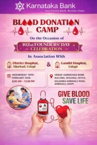 ಉಡುಪಿ: ಕರ್ಣಾಟಕ ಬ್ಯಾಂಕಿನ ಉಡುಪಿ ವಲಯ ಕಚೇರಿ ವತಿಯಿಂದ ಬ್ಯಾಂಕಿನ 102ನೇ ಸಂಸ್ಥಾಪಕರ ದಿನಾಚರಣೆ ಅಂಗವಾಗಿ ಉಚಿತ ವೈದ್ಯಕೀಯ ತಪಾಸಣೆ ಮತ್ತು ರಕ್ತದಾನ ಶಿಬಿರವನ್ನು ಉಡುಪಿಯ ಅಂಬಾಗಿಲಿನಲ್ಲಿರುವ ಬ್ಯಾಂಕಿನ ಉಡುಪಿ ವಲಯ ಕಚೇರಿ ಯಲ್ಲಿ ಫೆ. 18 ರಂದು ಬೆಳಗ್ಗೆ 8.30 ರಿಂದ ಮಧ್ಯಾಹ್ನ 12.30 ವರೆಗೆ ಆಯೋಜಿಸಲಾಗಿದೆ.