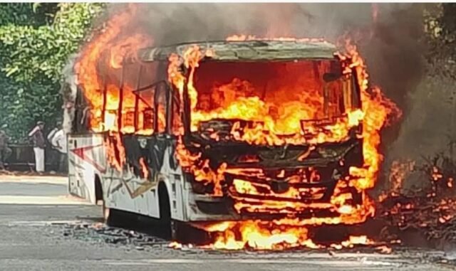 ಬಸ್ ಗೆ ಬೆಂಕಿ ಹತ್ತಿಕೊಂಡ ವಿಡಿಯೋ ದೃಶ್ಯಾವಳಿ ವೈರಲ್ ಆಗಿದ್ದು, ಇಡೀ ಬಸ್ ಸಂಪೂರ್ಣ ಸುಟ್ಟು ಕರಕಲಾಗಿದೆ.