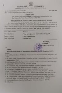 ಬೆಂಗಳೂರು : ಮಾ.10: ಬಳ್ಳಾರಿ ಜಿಲ್ಲೆಯ ಸಿರುಗುಪ್ಪ ತಾಲೂಕಿನ ಸಿರಿಗೇರಿ ಗ್ರಾಮದ ನಿವಾಸಿ, ಹಾಲಿ ಬೆಂಗಳೂರು ವಿಶ್ವವಿದ್ಯಾಲಯ ಸಂವಹನ ವಿಭಾಗದ ಸಂಶೋಧನಾರ್ಥಿ ಈಶ್ವರ್ ರವರಿಗೆ ಪಿಎಚ್.ಡಿ ಪದವಿ ಘೋಷಿಸಿದೆ.