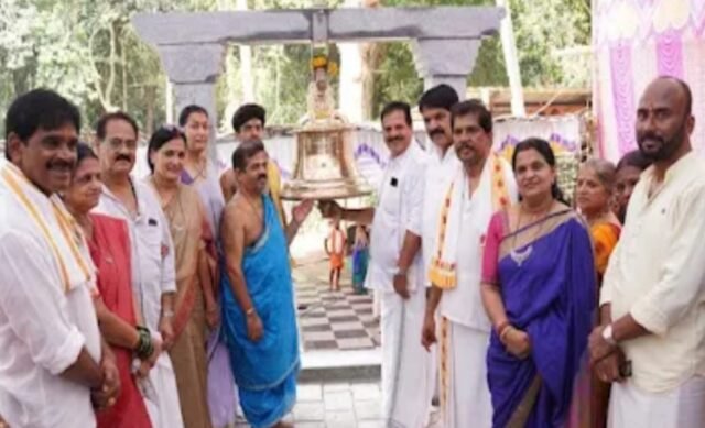 ಉಡುಪಿ:ಇಂದ್ರಾಣಿ ಶ್ರೀ ಮುಖ್ಯಪ್ರಾಣ ದೇವರ ಪುನರ್ ಪ್ರತಿಷ್ಠಾ ಬ್ರಹ್ಮಕಲಶೋತ್ಸವ ಸಂದರ್ಭದಲ್ಲಿ ಹನುಮ ಜಯಂತಿಯಂದು ಗುರುವಾರ ಶ್ರೀ ದೇವಳಕ್ಕೆ ಬೃಹತ್ ಘಂಟೆ ಸಮರ್ಪಿಸಲಾಯಿತು.