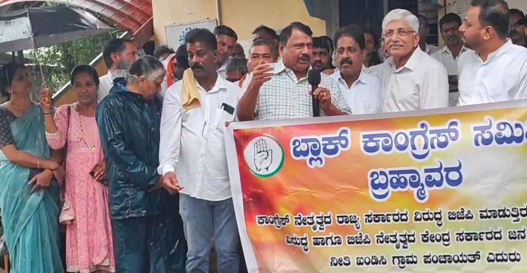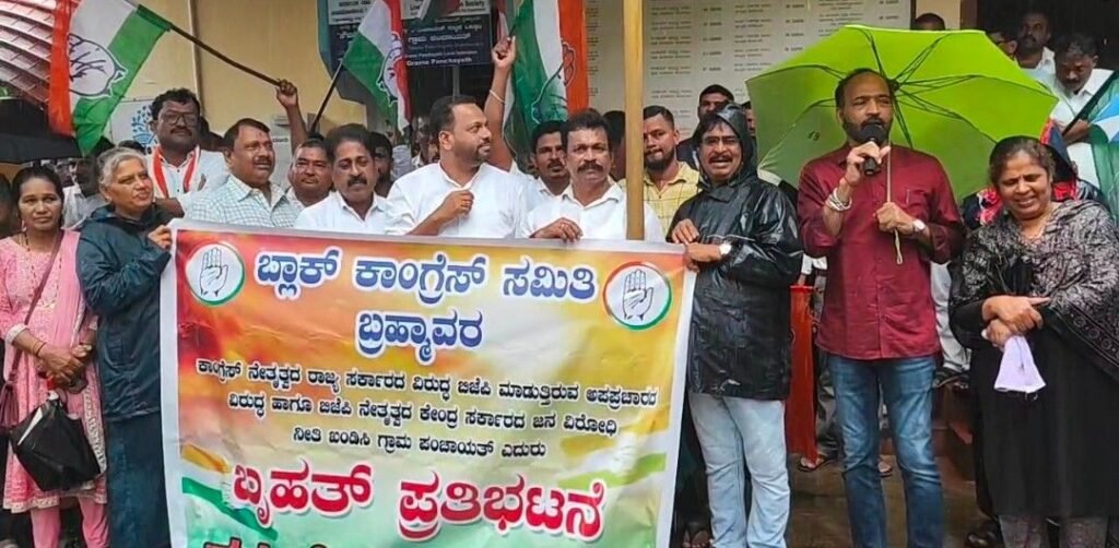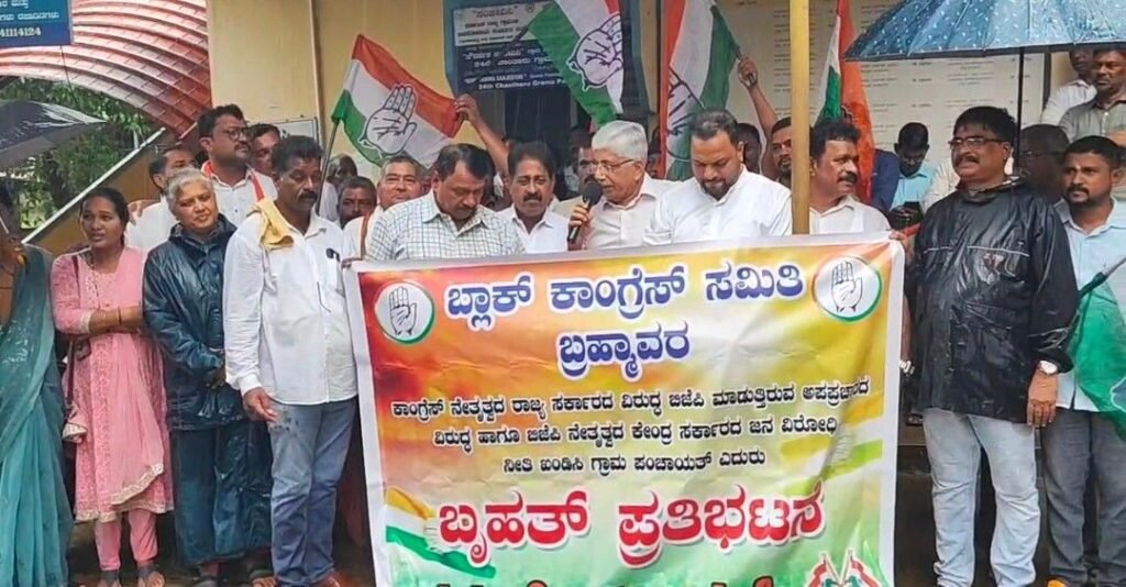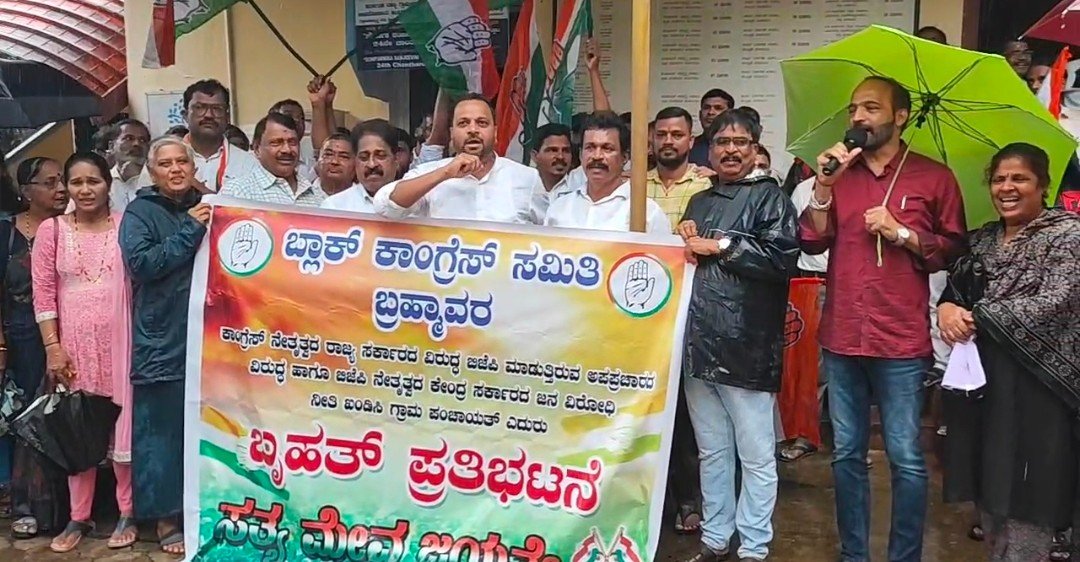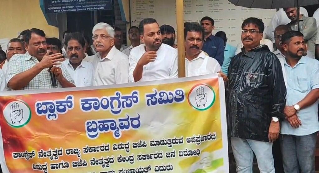 ಉಡುಪಿ: ರಾಜ್ಯ ಕಾಂಗ್ರೆಸ್ ಸರ್ಕಾರದ ವಿರುದ್ಧ ಬಿಜೆಪಿ ಮಾಡುತ್ತಿರುವ ಅಪಪ್ರಚಾರ ಹಾಗೂ ಕೇಂದ್ರ ಸರ್ಕಾರದ ಜನವಿರೋಧಿ ನೀತಿ ಖಂಡಿಸಿ ಬ್ರಹ್ಮಾವರ ಬ್ಲಾಕ್ ಕಾಂಗ್ರೆಸ್ ಸಮಿತಿ ನೇತೃತ್ವದಲ್ಲಿ ಬ್ರಹ್ಮಾವರ ತಾಲೂಕಿನ ಚಾಂತಾರು ಗ್ರಾಪಂ ಮುಂಭಾಗದಲ್ಲಿ ಮಂಗಳವಾರ ಪ್ರತಿಭಟನೆ ನಡೆಸಲಾಯಿತು.