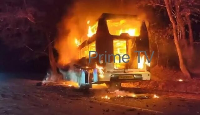 ಶ್ರೀ ಅನ್ನಪೂರ್ಣೇಶ್ವರಿ ಟ್ರಾನ್ಸ್ಪೋರ್ಟ್ ಸಂಸ್ಥೆಗೆ ಸೇರಿದ ಬಸ್ ಇದಾಗಿದ್ದು, ಬಸ್ ಸಂಪೂರ್ಣವಾಗಿ ಸುಟ್ಟು ಕರಕಲಾಗಿದೆ.