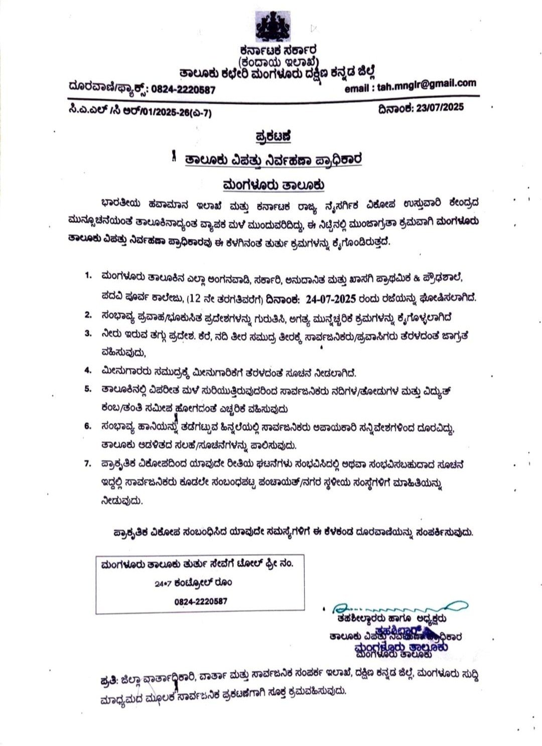 ಸರ್ಕಾರಿ,ಅನುದಾನಿತ,ಖಾಸಗಿ ಶಾಲಾ ಕಾಲೇಜುಗಳಿಗೆ ರಜೆ ಘೋಷಿಸಿದ್ದಾರೆ.ರಜೆ ಘೋಷಿಸಿ ಮಂಗಳೂರು ತಹಶಿಲ್ದಾರ್ ಆದೇಶ ನೀಡಿದ್ದಾರೆ.