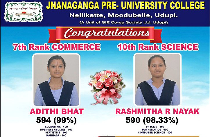 ವಾಣಿಜ್ಯ ವಿಭಾಗದಲ್ಲಿ ಕುಮಾರಿ ಅದಿತಿ ಭಟ್ 594 ಅಂಕಗಳೊಂದಿಗೆ ರಾಜ್ಯ ಮಟ್ಟದಲ್ಲಿ ಏಳನೇ ರಾಂಕ್ ಹಾಗೂ ವಿಜ್ಞಾನ ವಿಭಾಗದಲ್ಲಿ ರಶ್ಮಿತಾ ಆರ್ ನಾಯಕ 590 ಅಂಕಗಳೊಂದಿಗೆ ರಾಜ್ಯ ಮಟ್ಟದಲ್ಲಿ 10ನೆಯ ರಾ0ಕ್ ಪಡೆದಿದ್ದಾರೆ.