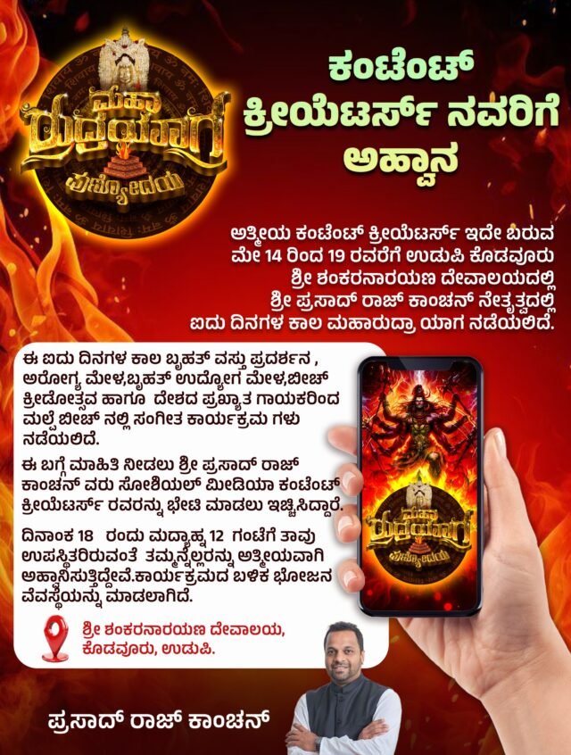 ಉಡುಪಿ: ಉಡುಪಿ ಜಿಲ್ಲೆಯ ಕೊಡವೂರುವಿನಲ್ಲಿರುವ ಶ್ರೀ ಶಂಕರನಾರಾಯಣ ದೇವಾಲಯದಲ್ಲಿ ಏಪ್ರಿಲ್ 14ರಿಂದ 19ರವರೆಗೆ ಶ್ರೀ ಪ್ರಸಾದ್ ರಾಜ್ ಕಾಂಚನ್ ನೇತೃತ್ವದಲ್ಲಿ “5 ದಿನಗಳ ಕಾಲ ಮಹಾ ರುದ್ರಯಾಗ ನಡೆಯಲಿದೆ