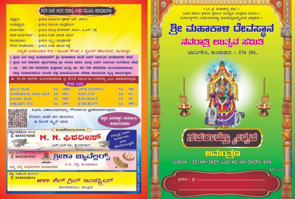 ಕುಂದಾಪುರ: ಇಲ್ಲಿನ ಖಾರ್ವಿಕೇರಿಯ ಶ್ರೀ ಮಹಾಕಾಳಿ ದೇವಸ್ಥಾನದಲ್ಲಿ ಶರನ್ನವರಾತ್ರಿ ಮಹೋತ್ಸವ ಸೆ. 22ರಿಂದ ಆರಂಭಗೊಂಡು ಅ.2ರ ವರೆಗೆ ಜರುಗಲಿರುವುದು.