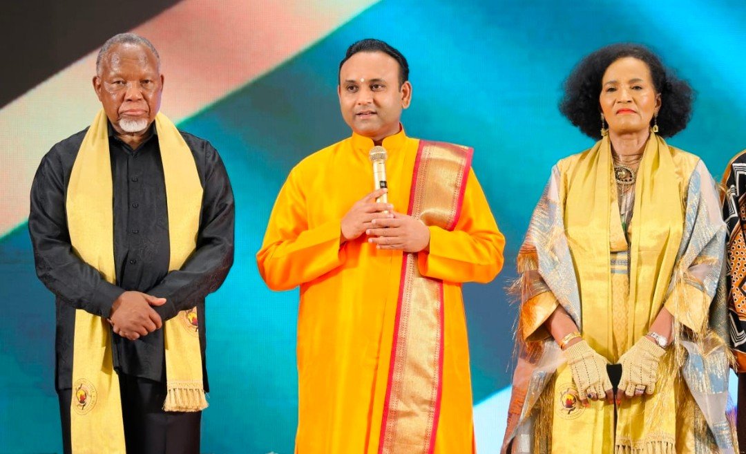 ‘ಒಂದು ಜಗತ್ತು ಒಂದು ಕುಟುಂಬ ವಿಶ್ವ ಸಾಂಸ್ಕೃತಿಕ ಮಹೋತ್ಸವ’ದಲ್ಲಿ ದಕ್ಷಿಣ ಆಫ್ರಿಕಾದ ಮಾಜಿ ಅಧ್ಯಕ್ಷ ಕೆಗಲೆಮಾ ಮೊಟ್ಲಾಂಥೆ ಅವರನ್ನು ಅವರ ಮಾನವೀಯ ಕೊಡುಗೆಗಳಿಗಾಗಿ ಸದ್ಗುರು ಶ್ರೀ ಮಧುಸೂದನ ಸಾಯಿ ಪುರಸ್ಕರಿಸಿದರು.
