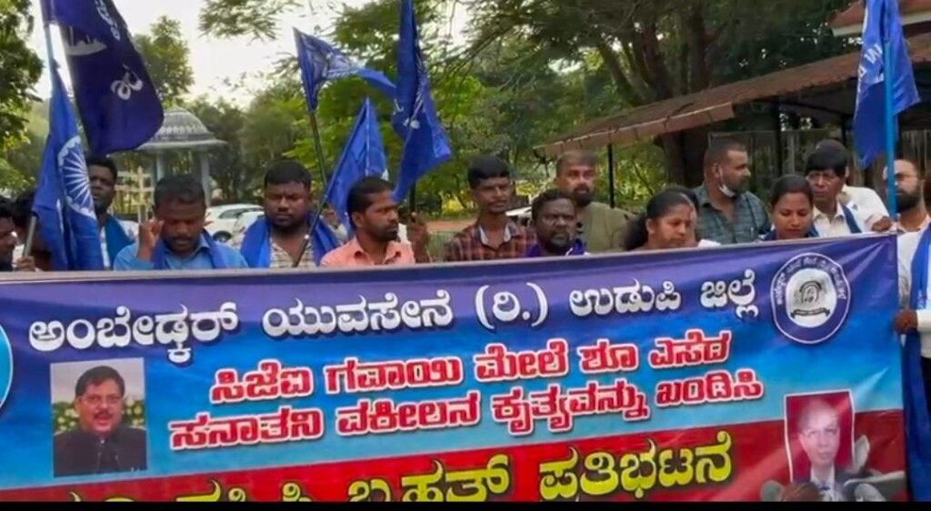 ಉಡುಪಿ : ಸಿಜೆಐ ಗವಾಯಿ ಅವರ ಮೇಲೆ ಶೂ ಎಸೆದ ವಕೀಲನ ಕೃತ್ಯ ಖಂಡಿಸಿ ಉಡುಪಿ ಜಿಲ್ಲಾ ಅಂಬೇಡ್ಕರ್ ಯುವಸೇನೆಯ ವತಿಯಿಂದ ಉಡುಪಿಯ ಅಜ್ಜರಕಾಡು ಹುತಾತ್ಮ ಸ್ಮಾರಕ ಬಳಿ ಪ್ರತಿಭಟನೆ ಹಮ್ಮಿಕೊಳ್ಳಲಾಗಿತ್ತು. ವಕೀಲ ರಾಕೇಶ್ ಕಿಶೋರ್ ಪ್ರತಿಕೃತಿ ದಹಿಸಿ ಆಕ್ರೋಶ ವ್ಯಕ್ತಪಡಿಸಲಾಯಿತು.