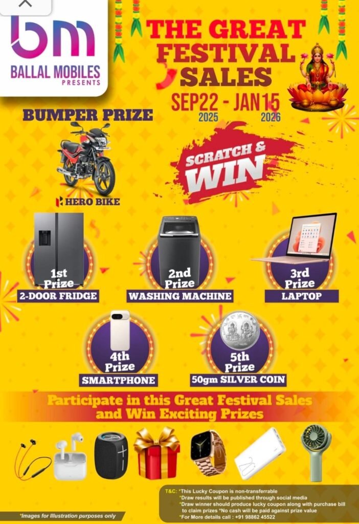 ಬಳ್ಳಾಲ್ ಮೊಬೈಲ್ಸ್ ನ “ದಿ ಗ್ರೇಟ್ ಫೆಸ್ಟಿವಲ್ ಸೇಲ್ಸ್” ನಲ್ಲಿ ಭಾಗವಹಿಸಿದ ಪ್ರತಿ ಗ್ರಾಹಕರಿಗೆ ಖಚಿತ ಉಡುಗೊರೆ ನೀಡುತ್ತಿದೆ. ಹಾಗೂ ಬಲ್ಲಾಳ್ ಮೊಬೈಲ್ಸ್ ನಲ್ಲಿ ಪ್ರತಿ ಮೊಬೈಲ್ ಫೋನ್ ಖರೀದಿಗೆ ಸ್ಕ್ರಾಚ್ ಅಂಡ್ ವಿನ್ ಬಹುಮಾನ ಗೆಲ್ಲಬಹುದಾಗಿದೆ. ಟಿವಿ, ಸ್ಪೀಕರ್, ಸ್ಮಾರ್ಟ್ ವಾಚ್, ಐರನ್ ಬಾಕ್ಸ್, ನೆಕ್ ಬ್ಯಾಂಡ್, ಬ್ಯಾಗ್, ತವ ಸ್ಟಿಕ್ ಹಾಗೂ ಇನ್ನಿತರ ಬಹುಮಾನಗಳು ಒಳಗೊಂಡಿವೆ.