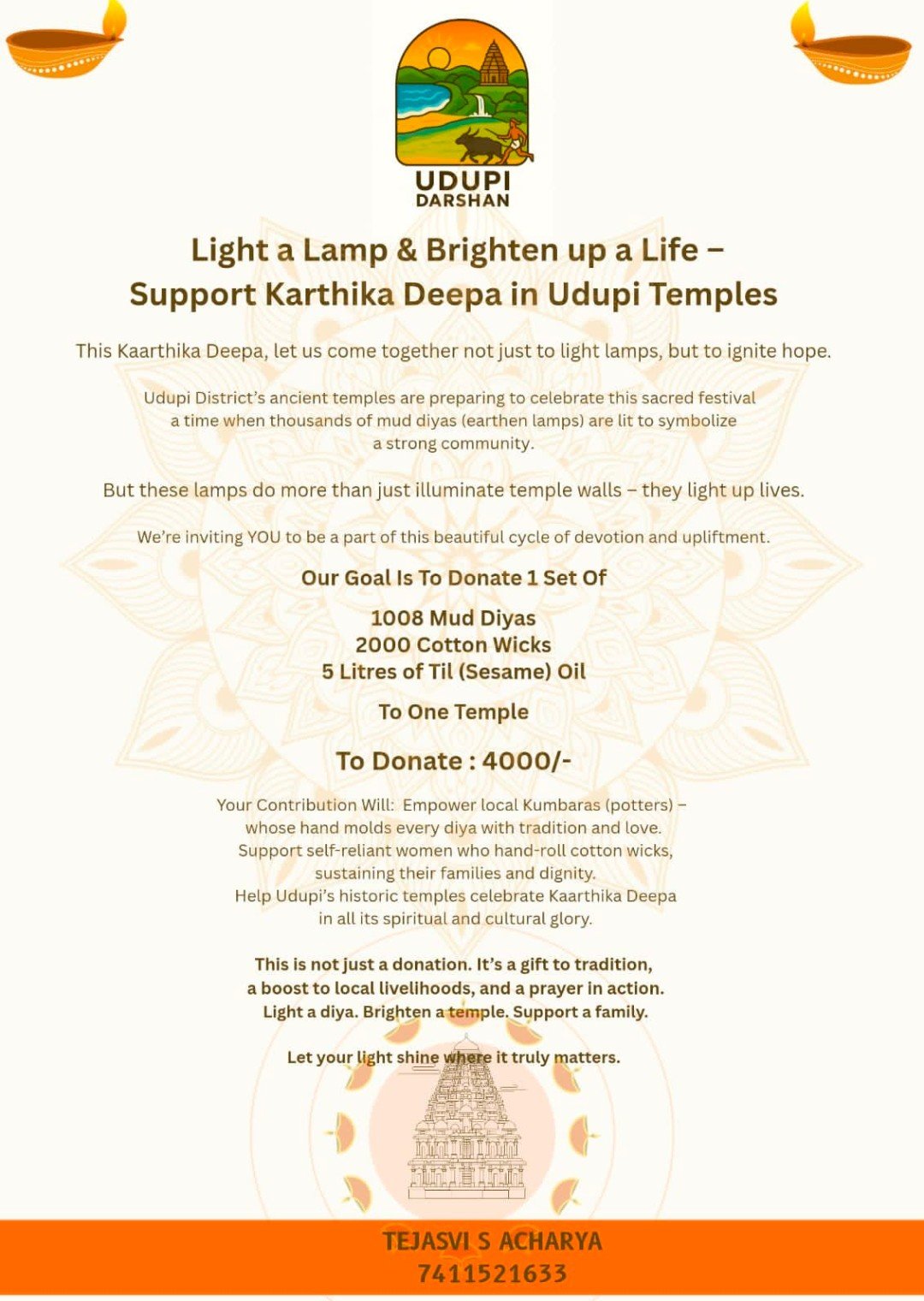 ಉಡುಪಿ : ಜಿಲ್ಲೆಯ ಪೌರಾಣಿಕ ದೇವಸ್ಥಾನಗಳಲ್ಲಿ ಕಾರ್ತಿಕ ಮಾಸದ ಪವಿತ್ರ ದೀಪೋತ್ಸವದ ಸಜ್ಜುಗಳು ನಡೆಯುತ್ತಿವೆ. ಈ ಹಿನ್ನೆಲೆ ‘ಉಡುಪಿ ದರ್ಶನ’ ವತಿಯಿಂದ “ಬೆಳಕಿನ ದೀಪ ಬೆಳಗಿಸಿ – ಜೀವನವನ್ನೂ ಬೆಳಗಿಸಿ” ಎಂಬ ಆಶಯದೊಂದಿಗೆ ವಿಶೇಷ ದೇಣಿಗೆ ಅಭಿಯಾನವನ್ನು ಆರಂಭಿಸಿದೆ.